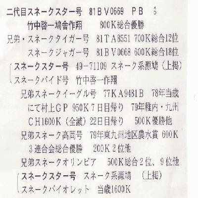 【三代目スネークスター号】灰刺し雄スネーク系三代目系統基礎鳩直子たちの中で、1羽の後継鳩四代目基礎鳩【四代目スネークスター号】を、選び選定しなければ、歴史は、続いてくれません。