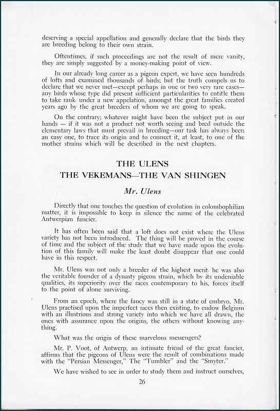 このことは、Vekemansが最も純粋なUlensの文化を受け継いだものであることを証明している。 この愛鳩家の死後行われたヴェケマン家[Vekemans]の売却は、リエールのウェッゲ[Wegge, of Lierre;]、ヴェルヴィエのハンセンヌとルール[Hansenne and Ruhl, of Verviers]、アントワープのソッフル[Soffle, of Antwerp]、ボルゲルハウトのファンデヴェルデ[Vandevelde, of Borgerhout]に、彼らの時代の最も驚くべき鳩を高値で購入する機会を与えたことは事実である。しかし、これらの愛好家のほとんどは、自分たちの文化を豊かにするために、これらの鳩を手に入れたに過ぎない。こうして、時が経つにつれ、彼らの子孫は、新しい所有者の名のもとに、その素晴らしい性質を持つ品種を、Vekmansから借りて、広げていった。