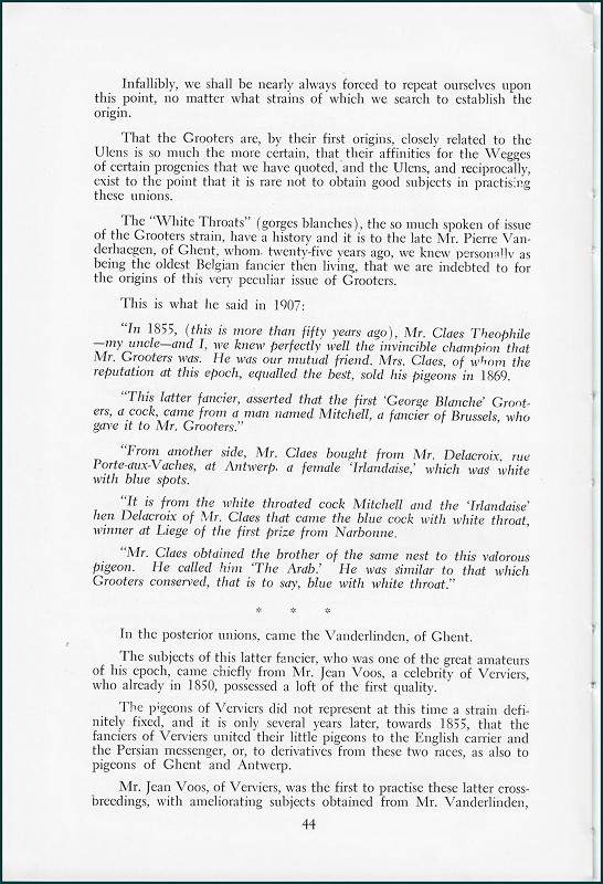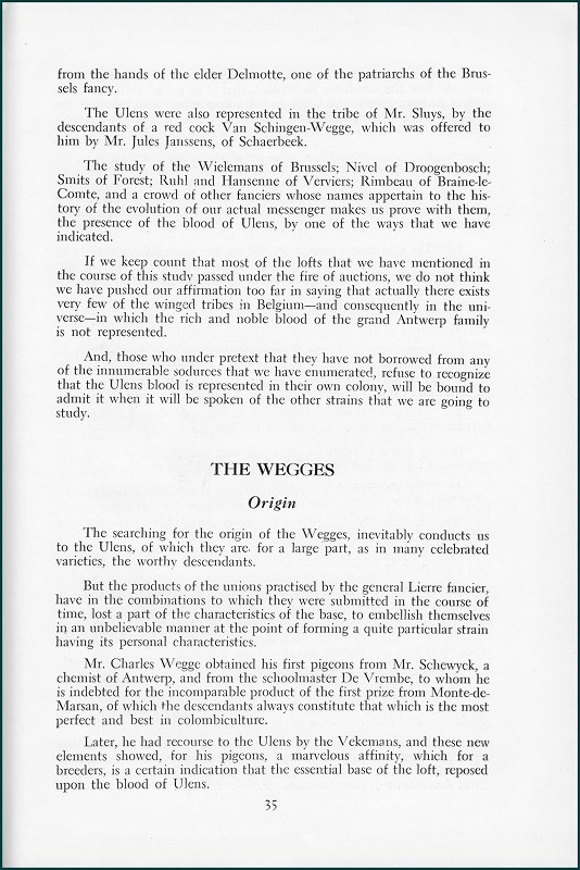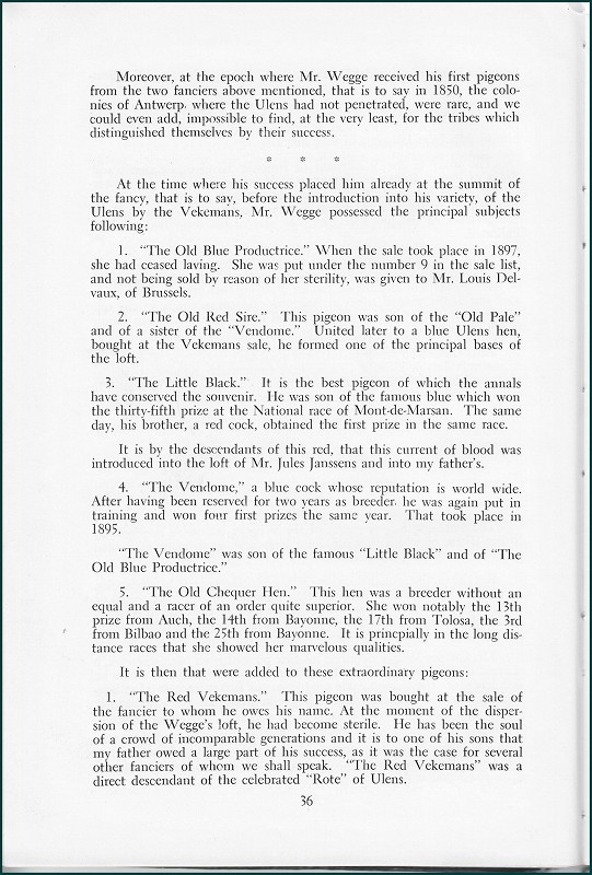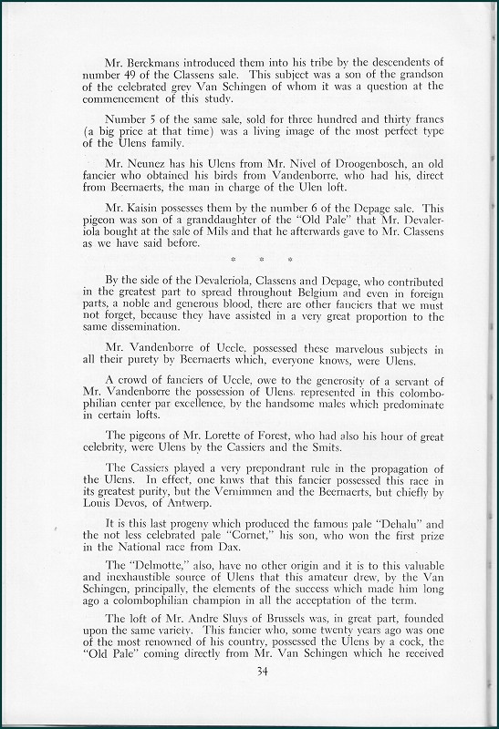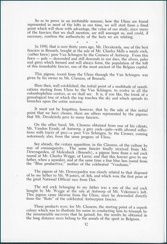 1896年、ブリュッセルのドパージュ氏[Mr. Depage]はデヴァレリオラ氏[Mr. Devaleriola] から、クラセンス氏[Mr. Classens] に贈られた「オールドペイル[“Old Pale”]」の孫と、アントワープのバンデンアインデ氏[Mr. Vanden Eynde]から受け取った「オールドグレー[“Old Grey” ]」クラセンスの娘から生まれた2羽の若いペイル[Pale]も受け取っている。この2羽の若い鳩は、デパージュ氏[ Mr. Depage ]が繁殖用として確保したもので、したがって純粋なウラン[Ulens]である。そしてまた、私がどうしても不倶戴天の党派である親族間の同盟の実践を証明する。それは、私がコンサングムの学校のコース[ the course at the school of consan]に従ってきたからではなく、この方法を実践しない人、知らずに採用している人にさえ見られる、驚くべき結果をもたらすと経験によって確信しているからである。