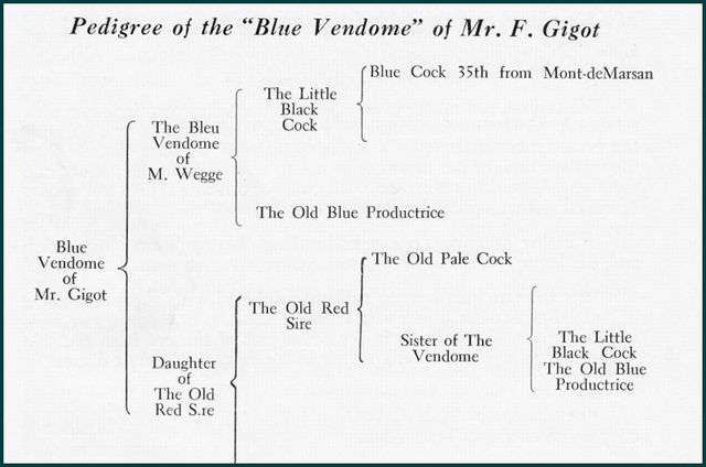 クラッセンの血縁関係による系統は、すでにお分かりの通りです。この鳩は、リエネのシャルル・ヴェッゲが飼育していた赤いコックから生まれたもので、この鳩は私の父に贈られ、同時に、有名な「ヴァンドーム」の母である「ブルー・プロダクトリス」から生まれた美しい青い雌鳩も贈られたのである。