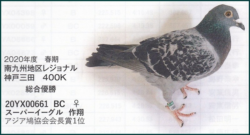 ◎■2020年春 500kRgレース ★★★連合会6位入賞!!★★★ ■参加23羽 当日6羽 翌日3羽 16日目1羽 19日目1羽 現在合計11羽 帰還率47,8% |