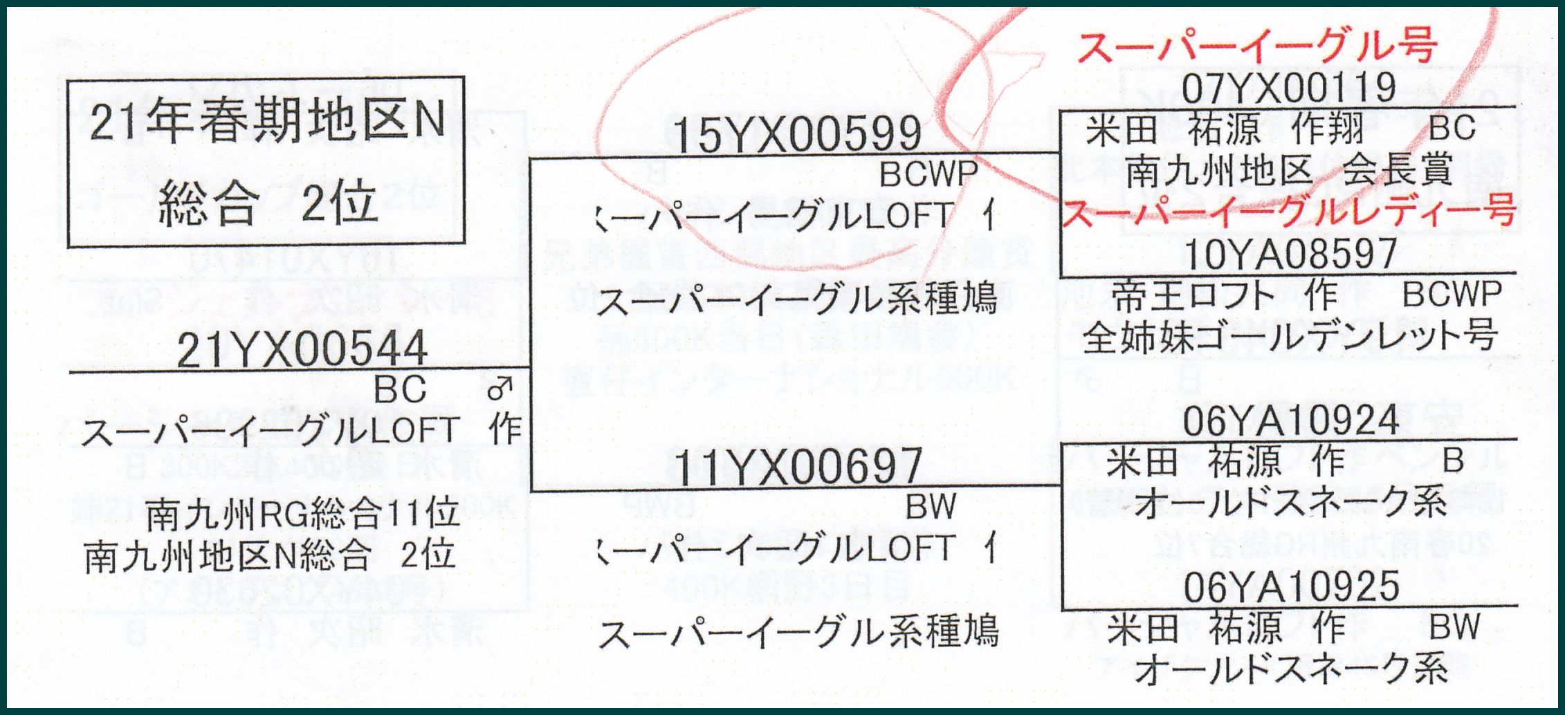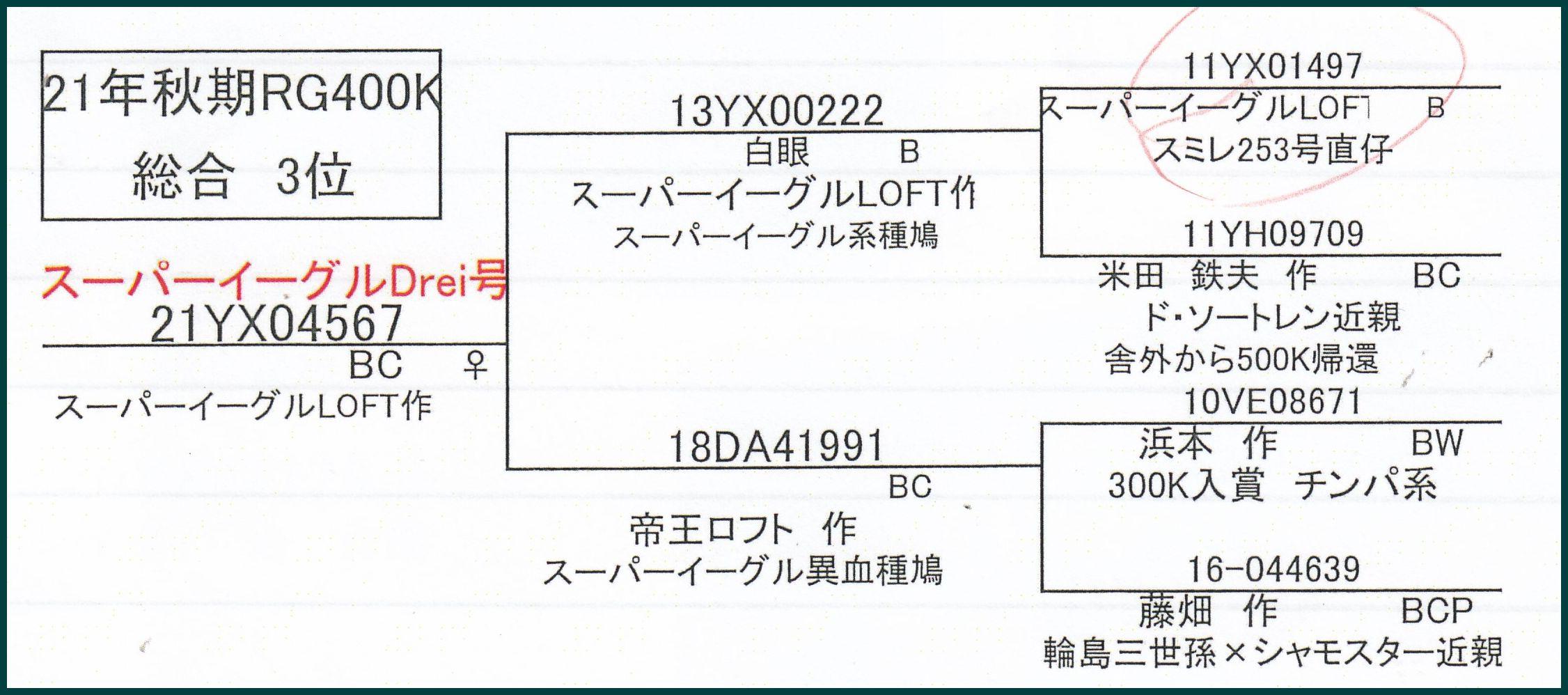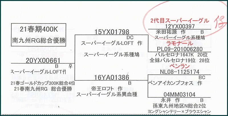 | 2022年春500kRGレース 連合会2位入賞 参加 ♂13羽 ♀10羽 計23羽 当日3羽記録 翌日12時30分時点 6羽記録 計9羽(記録率39,1%) イレブン 2022年3月22日(火) 5:19 |
