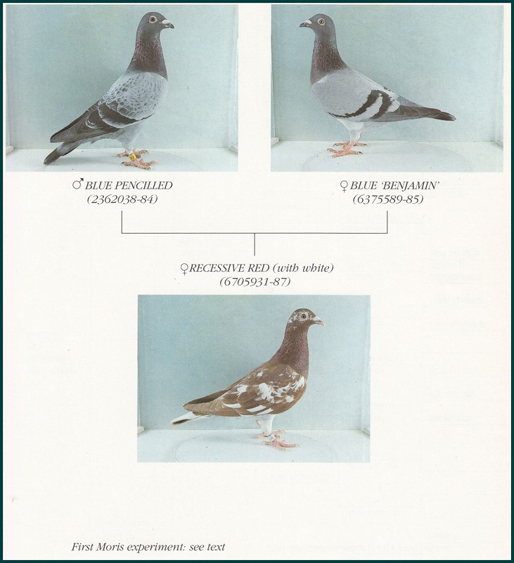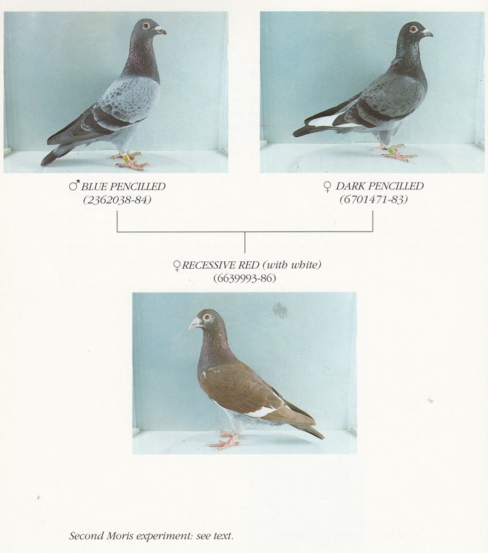 羽色PBは羽の軸に黒が被さ る鳩であり、通常のPBはW の羽色が出ることは少ない です。この鳩にBを交配した 例と同じPBにPBWを交配して 出来た劣性のRを示しました。