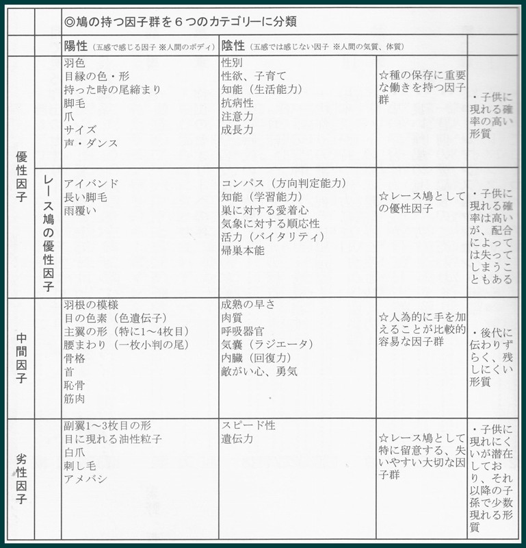 改めて総括いたしますと。まず陽性因子、陰性因子を作出論の基軸に据える。それ自体、卓抜なことですか、交配のメソッドをより具体的に展開するために、引きつづき優性、中間、劣性因子を第2の基軸にもってくる。レース鳩においてはひたすら劣性因子を愛好家たちが追究してきた帰結としてレース鳩自身の劣化をもたらすという指摘は鳩界への「警鐘」であると痛感いたしました。