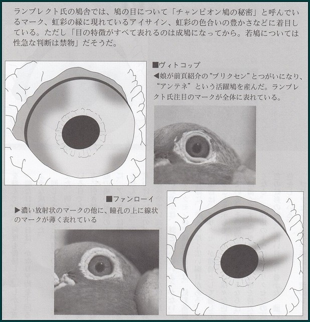 アドレアーンの凄さというのは自分で鳩を作ってみてわかります。ああ、よく出来たなと思った時にフッと思う。毎年、そういうヒナは出来るのですか…、私自身が満足するようなそんなトリをアドレアーンは日常的に作っていました。本人は前面に出て有名になることはありませんでしたか、たとえばポンテーローザ、アイヤーカンブの05カンプハイスやヴ″ンダーフォスケなどのオリジンを作っていると思うと尋常ならざるものを感じます。